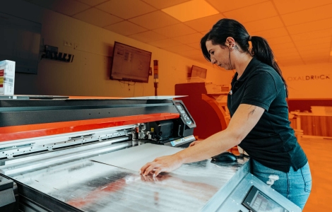 Wir produzieren am Tag knapp 25 m² bedruckte Aluminiumplatten.